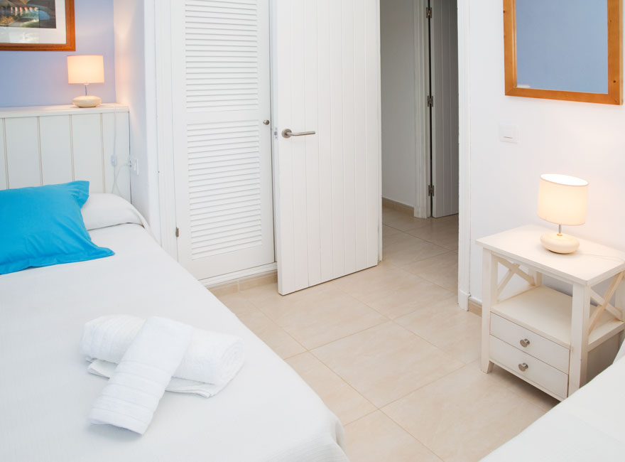 2 Bedroom apartments have two twin bedrooms, with two single beds, ceiling fans, one full bathroom, a dining-room with open kitchen, living area and a terrace with spectacular views to the beautiful beach of Son Son Bou.